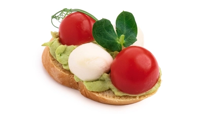 Salmon Tartine: Toasted bread, Cream cheese, Smoked salmon, Capers, Black pepper Salmon Roulade: Smoked salmon, Cream cheese, Tortilla or flatbread (Wheat Flour, Water, Vegetable Oil, Salt), Fresh herbs Caprese Avocado Tartine: Baguette (Wheat Flour, Water, Yeast, Salt), Avocado, Cottage Cheese (Milk, Salt), Mozzarella (Milk, Salt), Cherry Tomatoes Caprese Tartine: Bread, Avocado, Mozzarella cheese, Cherry tomatoes, Basil, Balsamic glaze