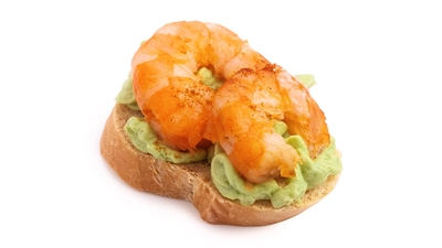 Prawn & Avocado Tartine: Baguette (Wheat Flour, Water, Yeast, Salt), Avocado, Cottage Cheese (Milk, Salt), Cooked Prawns (Crustaceans, Salt)