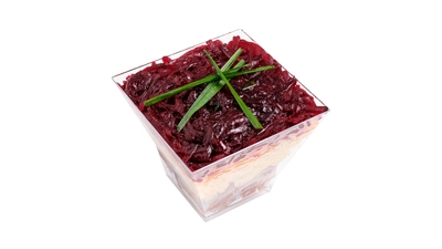 Shuba Salad Cup: Beetroot, Herring, Potatoes, Carrots, Onion, Mayonnaise, Chives
