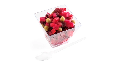 Root Vinaigrette Cup: Beets, Sweet potatoes, Carrots, Olive oil, Vinegar, Salt, Pepper, Green olives